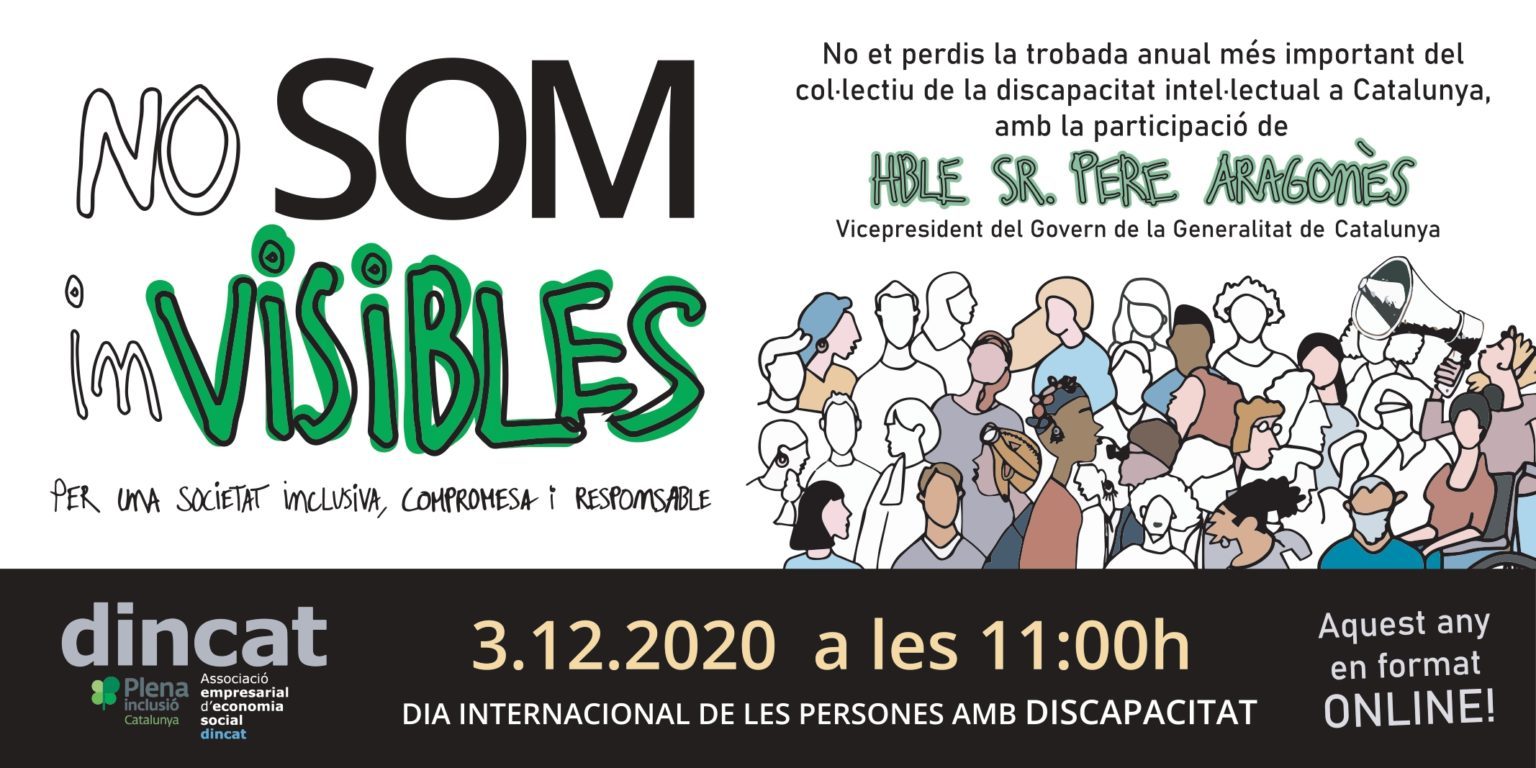 3 de desembre de 2020. Dincat, representant del sector de la discapacitat intel·lectual a Catalunya, ha impulsat, amb motiu del Dia Internacional de les Persones amb Discapacitat, la campanya #NoSomInvisibles, amb l’objectiu de denunciar el gran desconeixement que hi ha entorn les persones amb discapacitat intel·lectual i les seves necessitats tant en l’àmbit administratiu, polític, social com, fins i tot, sanitari. Una desconeixença que s’ha fet més evident que mai aquest 2020 arran de la pandèmia i que porta a situacions discriminatòries, al manteniment de prejudicis i estereotips i a polítiques insuficients que ens allunyen de la Convenció sobre els Drets de les Persones amb Discapacitat, aprovada per l’ONU el 2006.